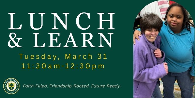 Join us over lunch to learn about the programs we offer for individuals with intellectual disabilities and why families have chosen Green Oaks for over 25 years. We will have a short tour of our campus followed by lunch and an overview of Green Oaks School, GOAL (Green Oaks Adult Learning), Green Oaks Life Prep, & our summer options. This is a wonderful opportunity to connect, hear more about what we do, and ask questions. RSVPs are required to ensure we will have enough lunch for everyone. All are welcome to attend! RSVP Here: https://lp.constantcontactpages.com/ev/reg/akscjm6